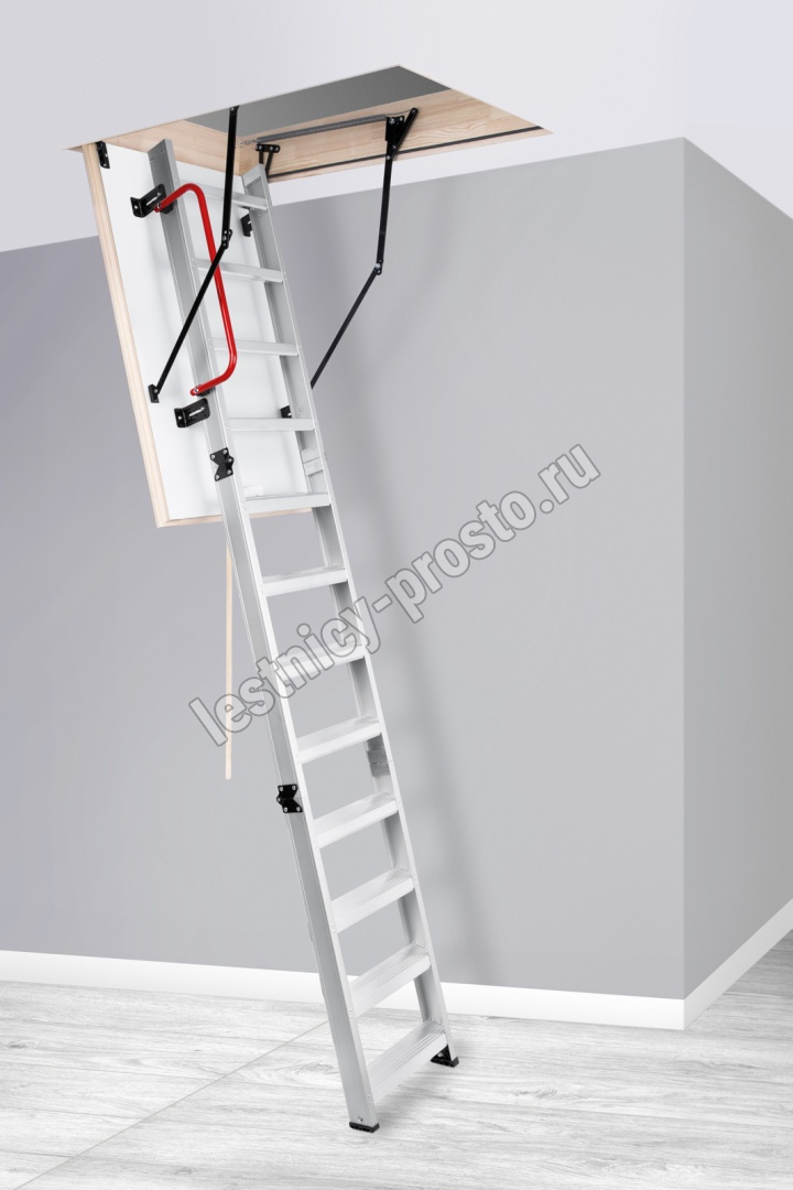 Лестница складная трехсекционная. Модель ALU PROFI идеальна для условий, когда чердак плохо утеплен и требует дополнительной теплоизоляции. Отличительной чертой лестницы ALUPROFI является легкая и чрезвычайно прочная лестница из алюминия высочайшего качества. Лестницы имеют нескользящие ножки, которые идеально прилегают к земле, предотвращают появление царапин на поверхности пола и придают лестнице эстетичный вид после ее резки.