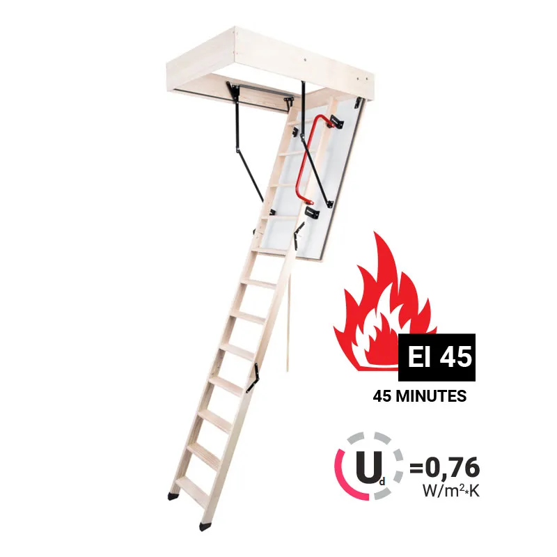 Чердачная лестница MAXI EI 45 имеет класс огнестойкости EI45, что означает 45-минутный предел сопротивления пожару.