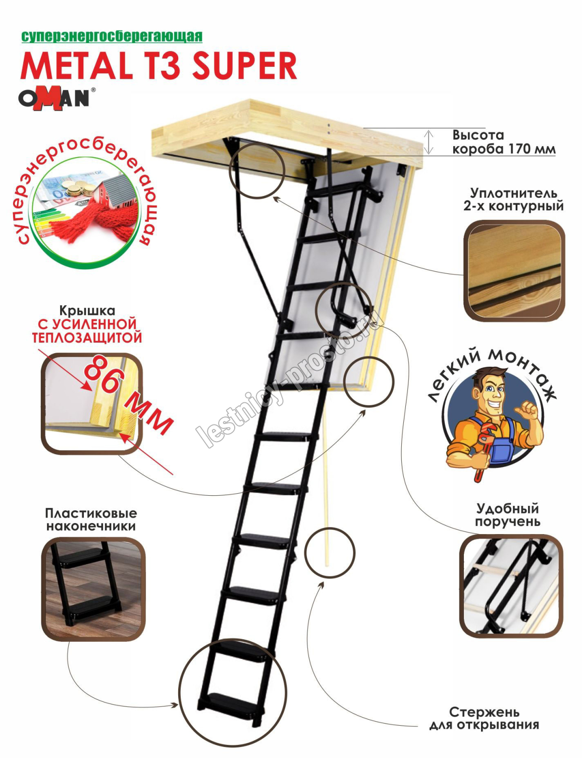 Чердачная лестница OMAN Metal T3 SUPER 55×120 см, h-280 см