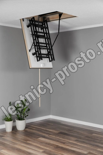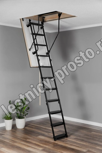 Противопожарная лестница, огнестойкость EI 60 Лестница чердачная складная металлическая 3-х секционная. Ступени полностью выполнены из металла и покрашена порошковой краской. Термоизоляционная крышка типа “сэндвич “, толщиной 66мм, утеплена пенопластом , облицована с двух сторон ДВП белого цвета. Короб деревянный высотой 170мм. Лестница имеет 3 уплотнителя, один проходит по периметру короба, и два по периметру крышки люка, в том числе и противопожарный.
