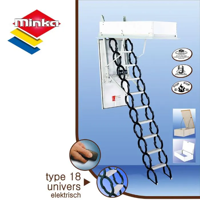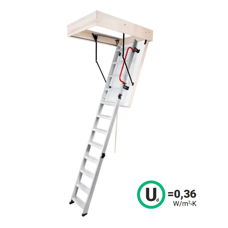 Складная 3-х секционная чердачная лестница. Рабочая поверхность полностью выполнена из алюминия. Термоизоляционная крышка типа "сэндвич" имеет усиленную теплозащиту, облицована с двух сторон ДВП белого цвета. По контуру короба имеется уплотнитель; Все металлические элементы лестницы покрыты порошковой краской.