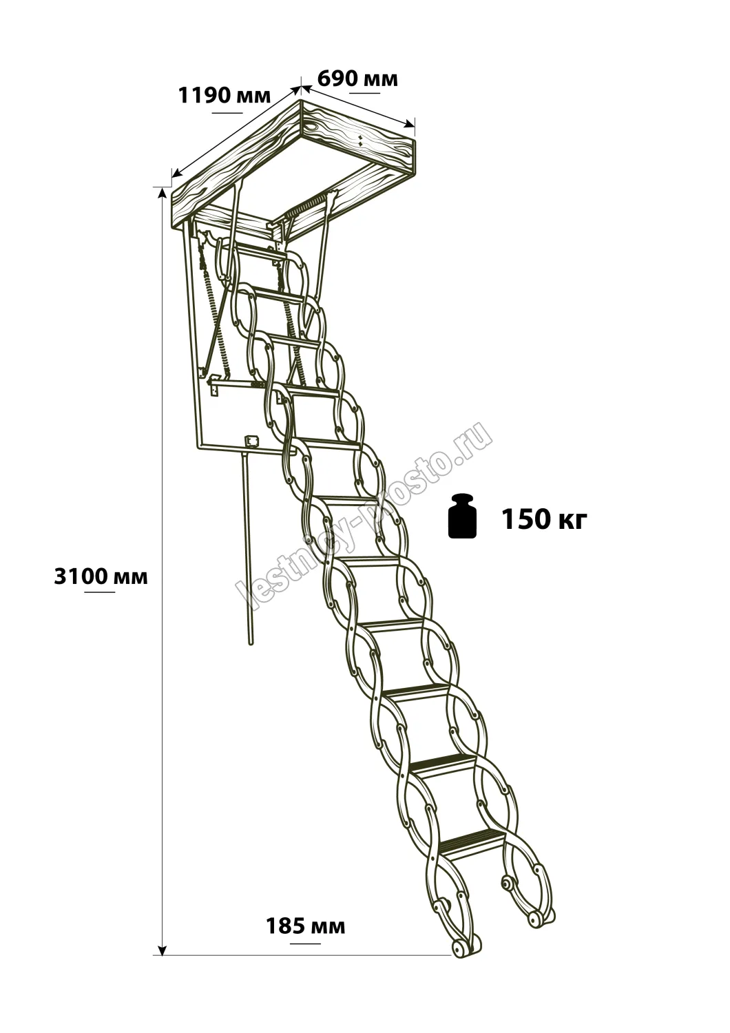 Материалы: корпус и утепленный люк из древесины хвойных пород с теплоизоляцией из пенопласта; ступени и тетивы из металла для максимальной прочности.