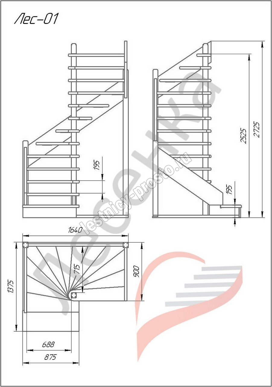 Деревянная межэтажная лестница ЛЕС-01 2525-2720 проем 1640-900, Лиственница