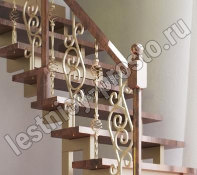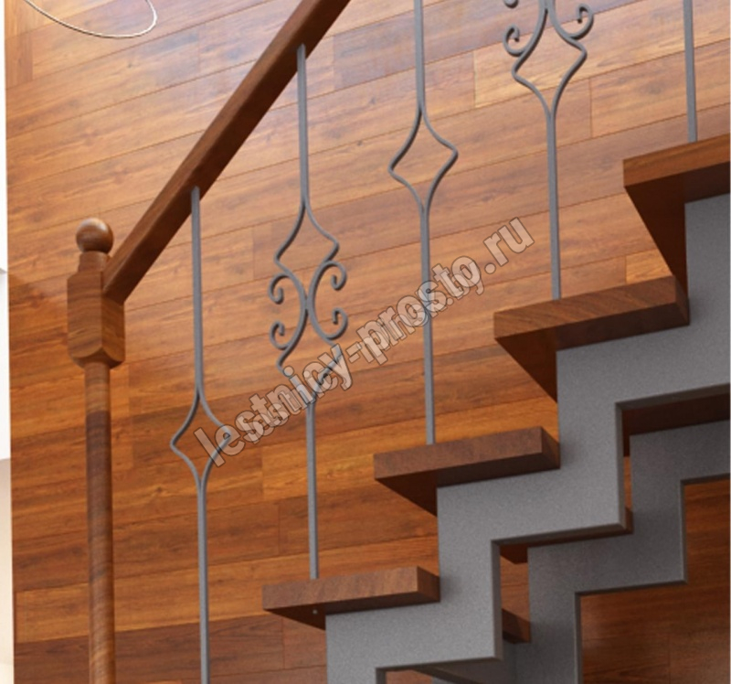 Кованые элементы и деревянные столбы можно выбрать по каталогу (после оформления заказа, мы вышлем вам фото образцов). Деревянные элементы: столбы и поручень по умолчанию идут без окрашивания, металлические элементы окрашены в цвет каркаса лестницы. Ограждение начинается со второй ступени.