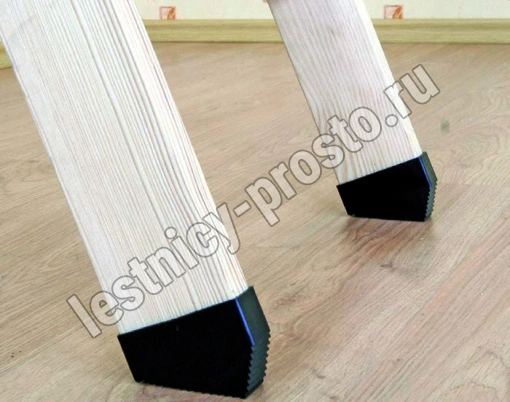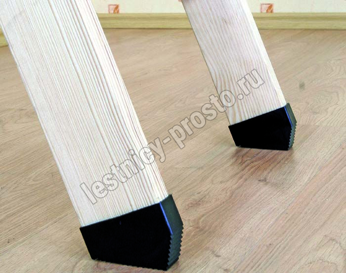 Изготавливаются из поливинилхлорида, защищают пол от возможных царапин, делают лестницу более устойчивой, облегчают подгонку длины лестницы, когда ее необходимо немного укоротить, за счет того, что в своей конструкции такая насадка уже имеет скос и две направляющие лестницы достаточно обрезать под прямым углом. Плотно одеваются на края двух направляющих и фиксируются еще и саморезом - закручивается снизу (в деревянных моделях).