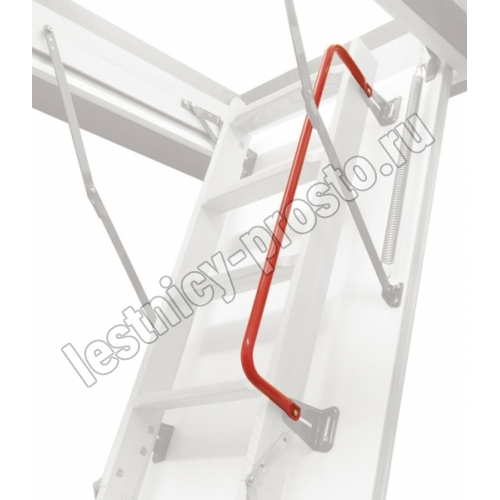 Боковой металлический поручень LXH красного цвета облегчает передвижение по лестнице и крепится к угловым петлям крышки люка. Может устанавливаться с одной или с обеих сторон лестницы.