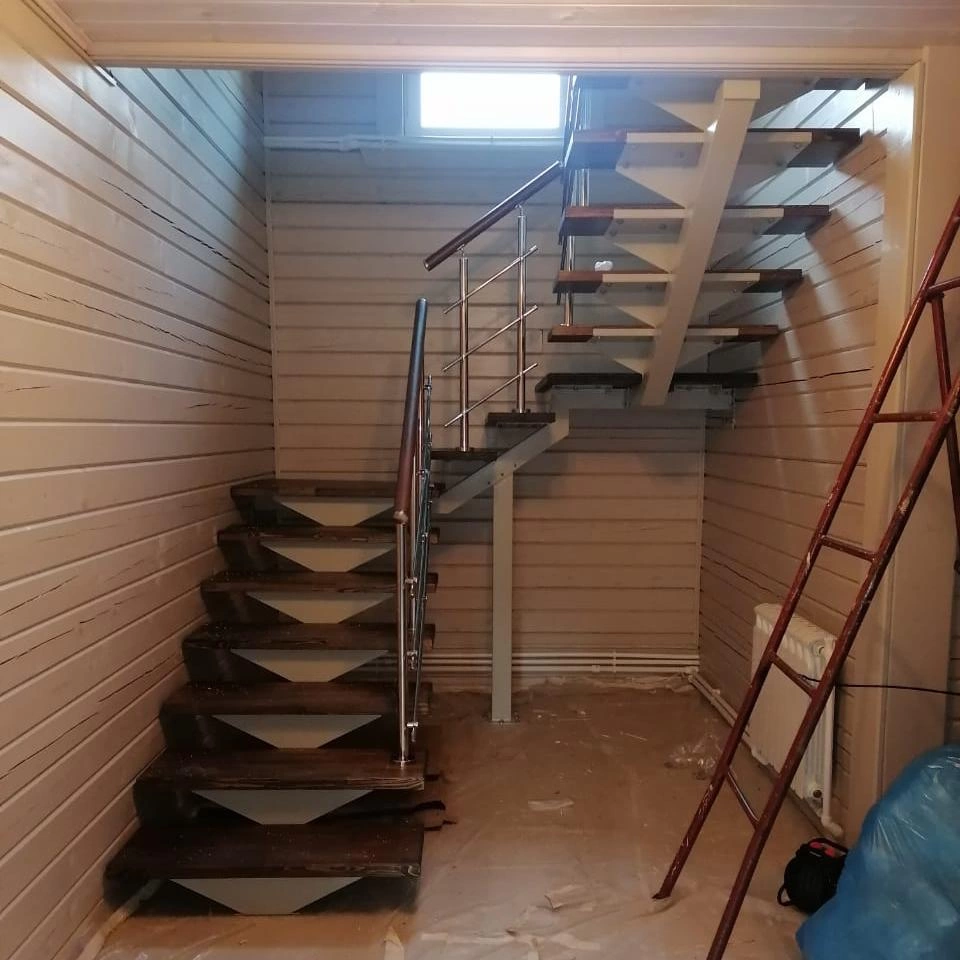 Конструкция представляет собой стальной монокосоур, на который крепятся ступени из выбранной породы дерева.