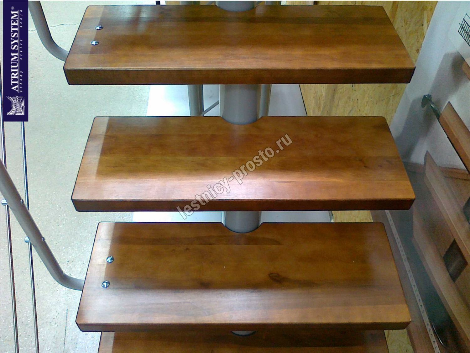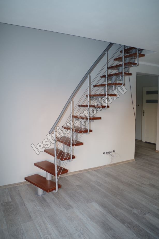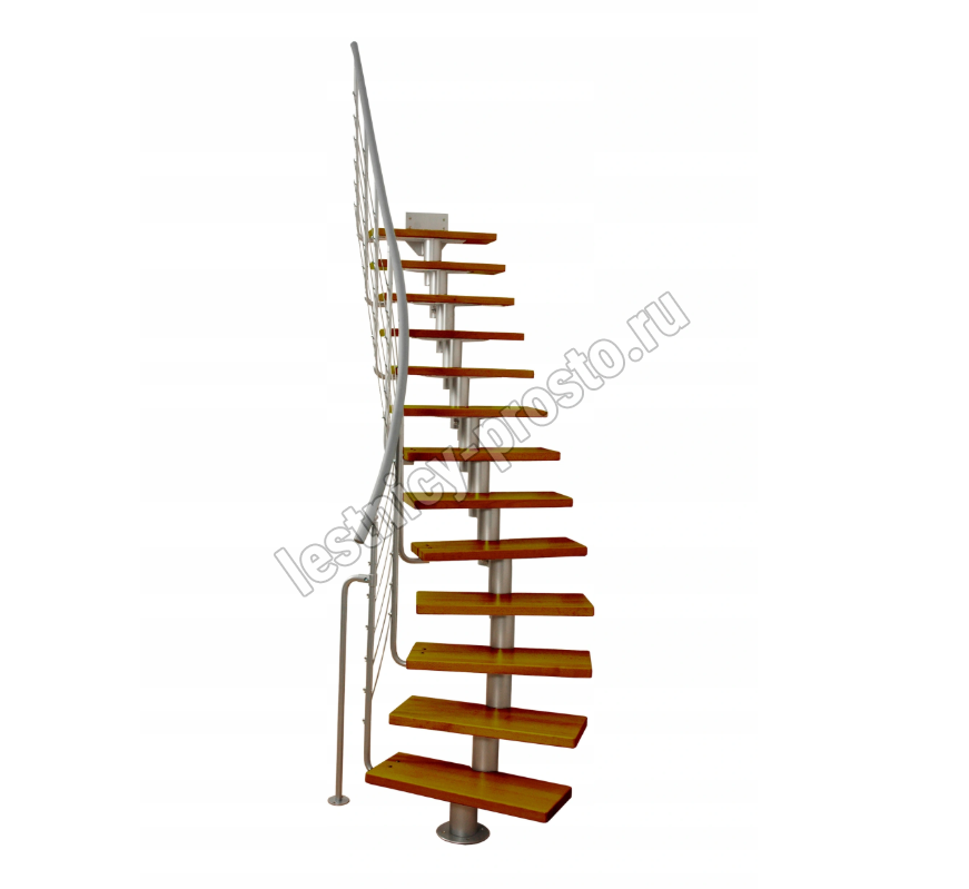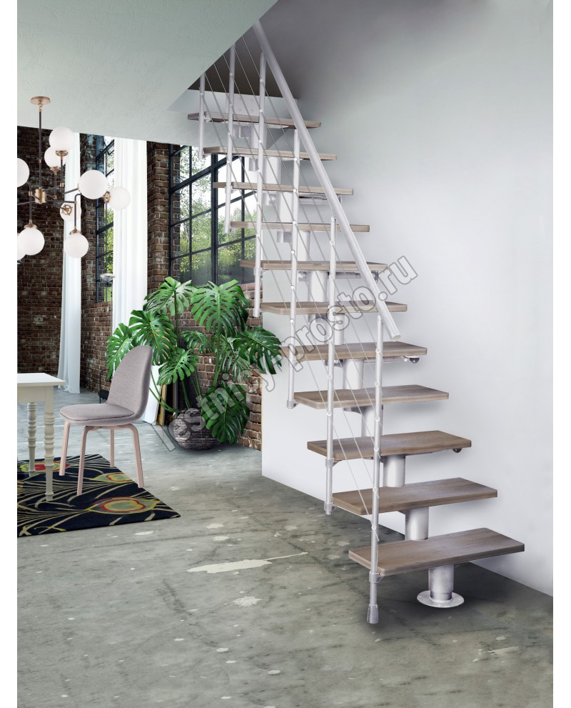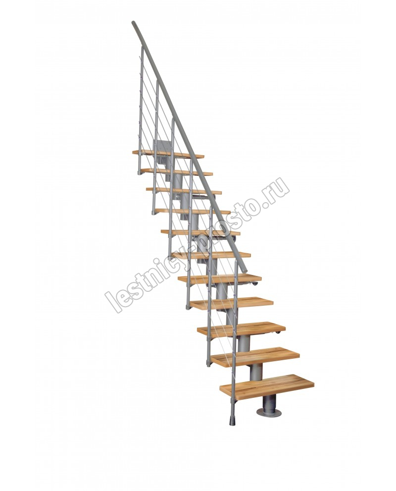 Лестница на стальном модульном каркасе. Высота лестницы регулируется при сборке засчет регулировки высоты шага. Ступени покрыты защитным лаком. Ограждение из стали с пластиковым поручнем. В комплект входят перила с вертикальными стойками и горизонтальными перегородками. Изделие поставляется с шурупами (кроме потолочных и напольных анкеров), инструкциями по монтажу и эксплуатации и гарантией. Внимание! Для этой лестницы необходимо крепление к стене.