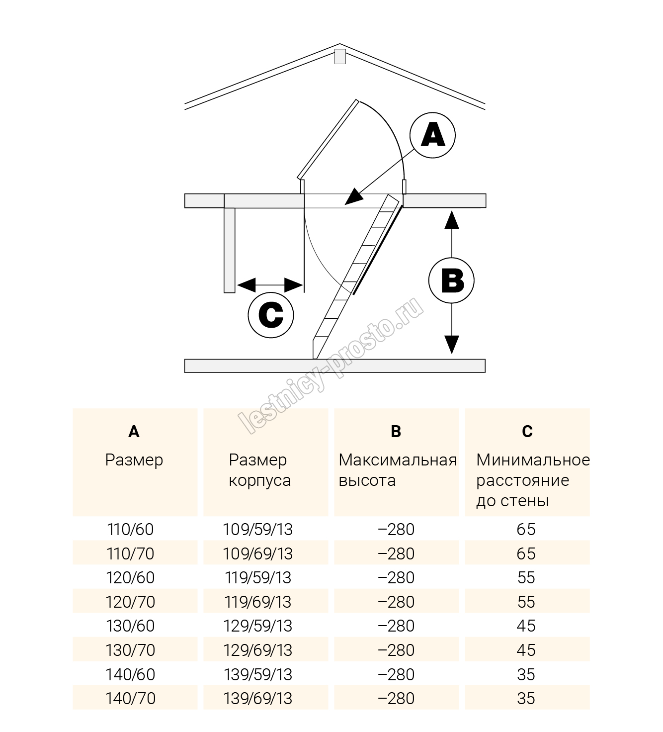 Возможна установка лестницы в разных по высоте помещениях, в пределах от 220 до 280 см.