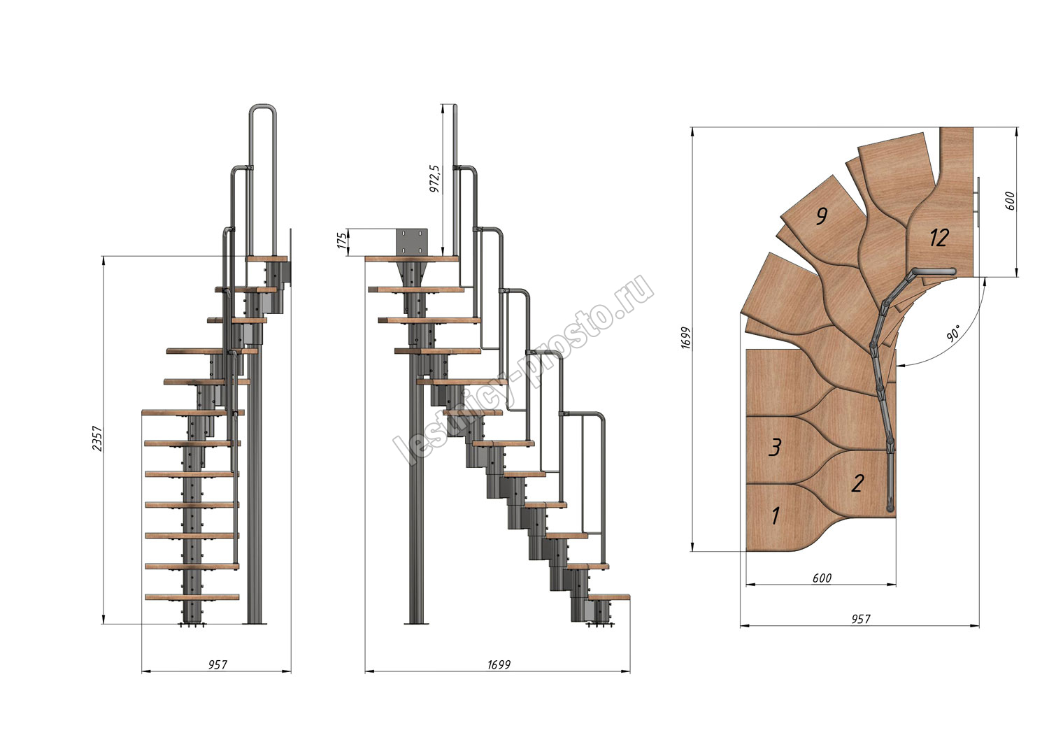 Лестница Prosto Urban Black гусиный шаг 600 мм, h216-312 см (12 ступеней), ясень