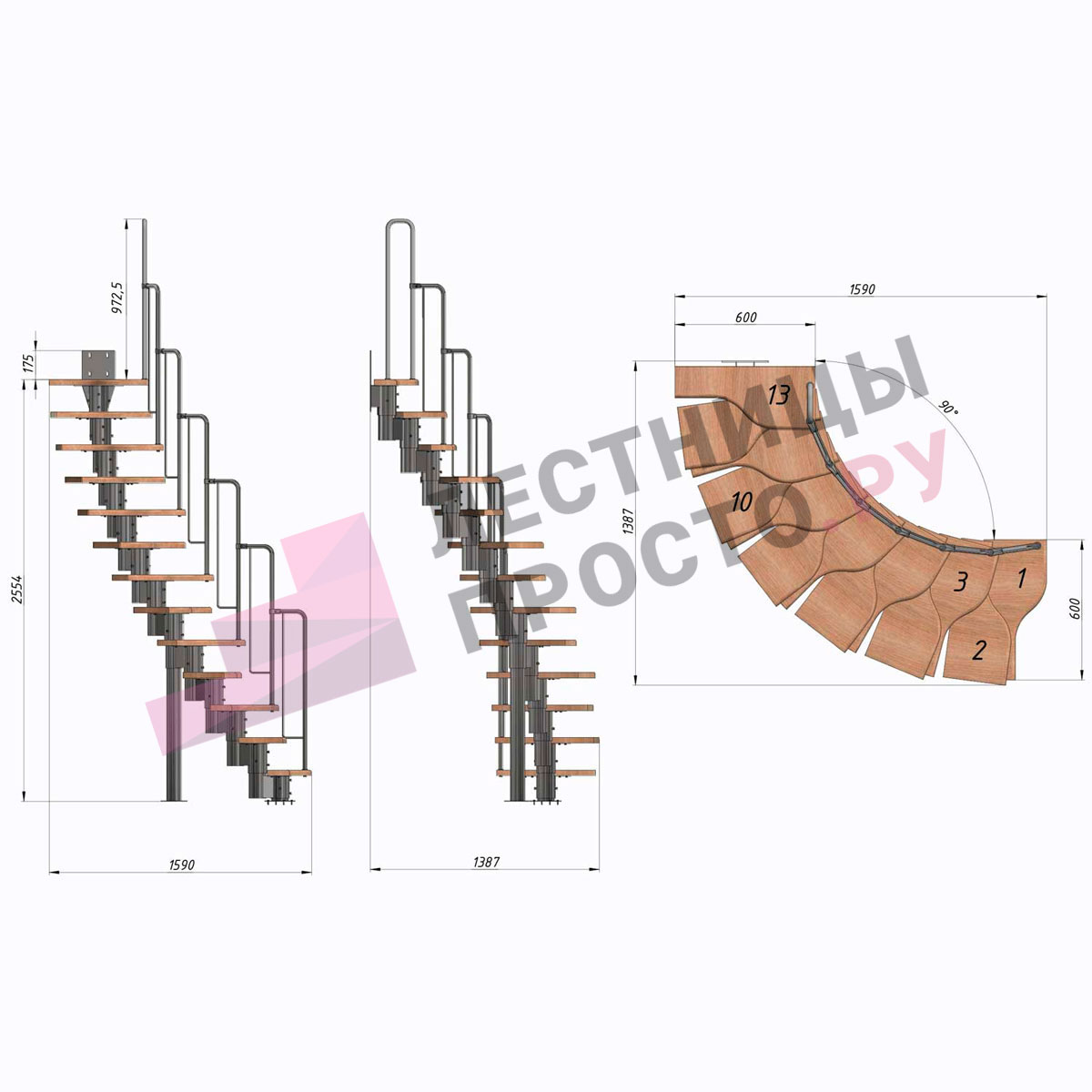 Лестница Prosto Urban Grey г-образная гусиный шаг 600 мм/ Ступени из берёзы мультиплекс
