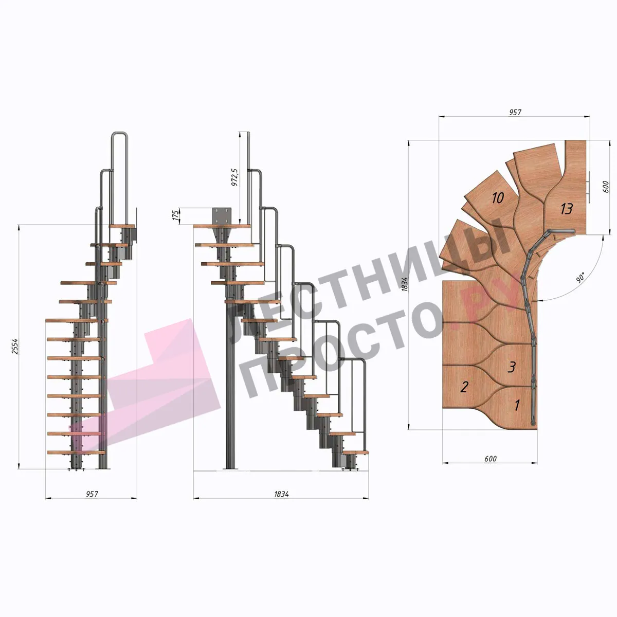 | Лестница Prosto Urban Grey г-образная гусиный шаг 600 мм, h234-336 см (13 ступеней) |
