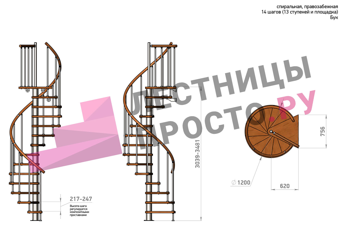 Высота лестницы 3039 - 3481 (13 ступеней) мм