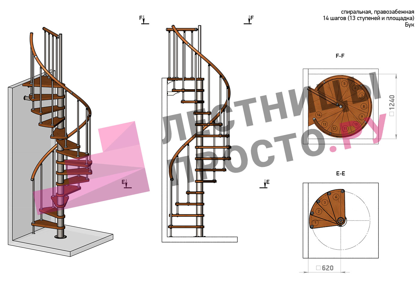 Правая, d=120см, 14 ступеней + площадка