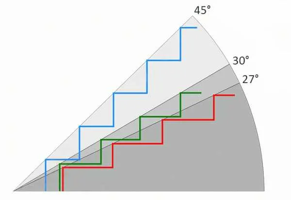 Угол подъёма лестницы угол между горизонталью и линией хода, который зависит от ширины проступи и её высоты. Угол подъёма определяет комфортность и безопасность лестницы, наиболее удобными считаются модели с углом подъёма 30-40 градусов.